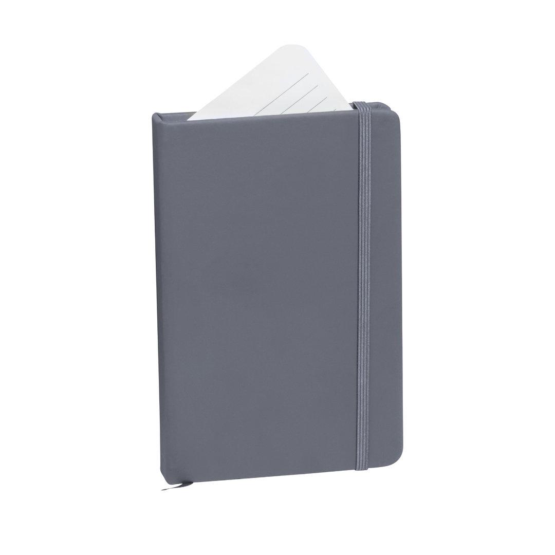 Bloc de notas con tapas de suave tacto, acabado en polipiel y en desenfadados colores. Con 100 hojas de distribución a una raya, elástico de sujeción y marcapáginas de tela a juego.
