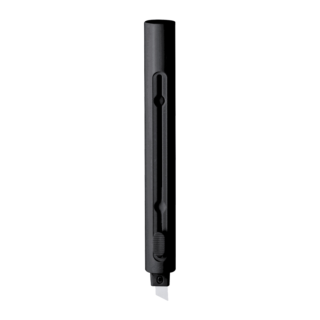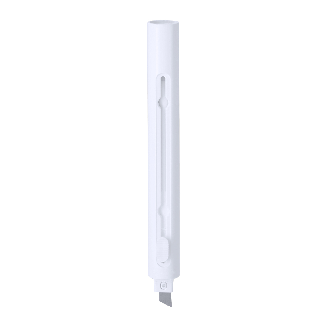 Bolígrafo cúter con cuerpo en ABS en acabado mate. Con pulsador que permite que por un extremo salga el cuerpo del bolígrafo en tinta azul y en el otro extremo punta de metal del cúter se puede retraer cuando no está en uso para mayor seguridad. Ideal para cortar con precisión.