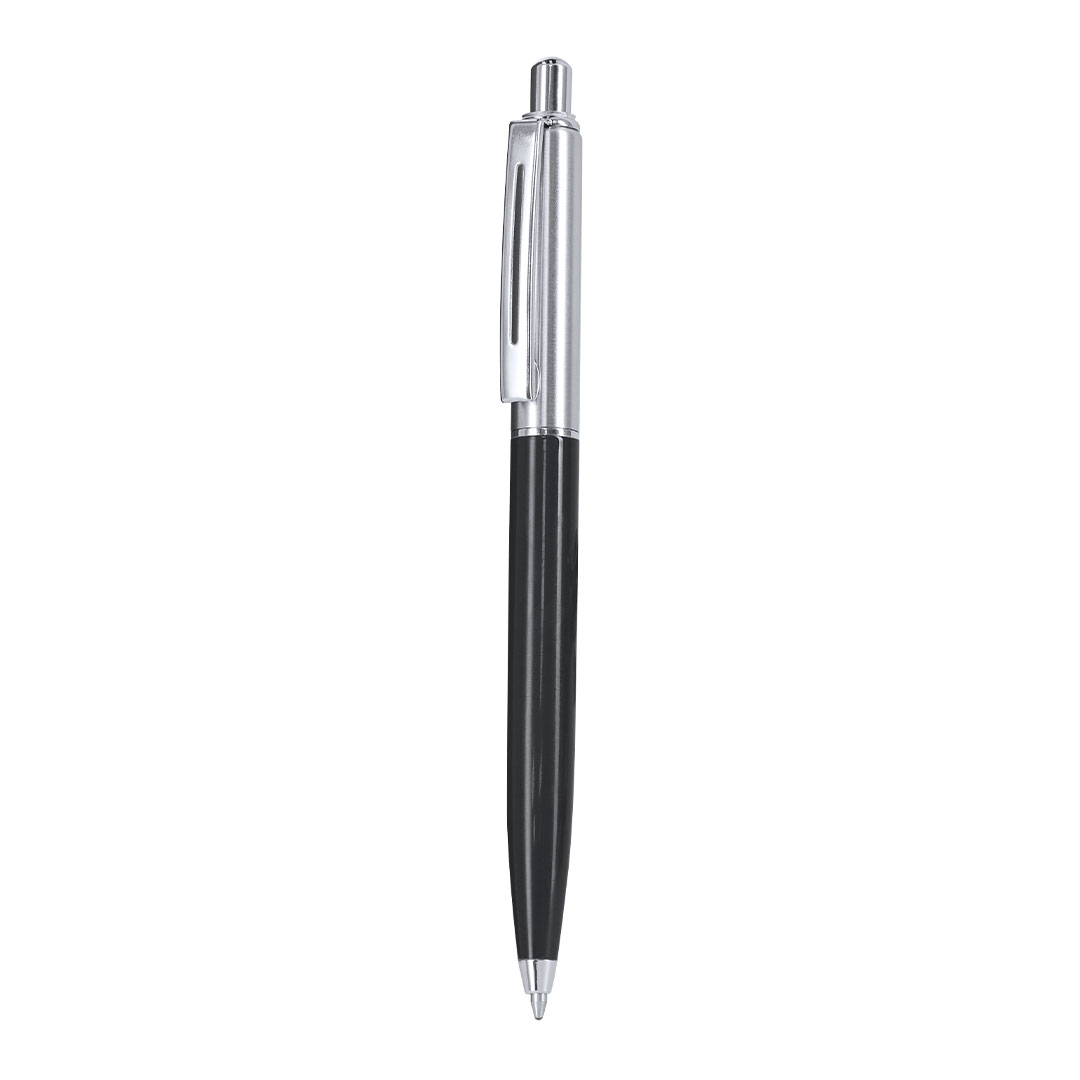 Bolígrafo de acabado metalizado. Con mecanismo pulsador y punta retráctil, clásico cartucho interior en tinta azul. Con clip metalizado y mitad de cuerpo en color sólido brillante.