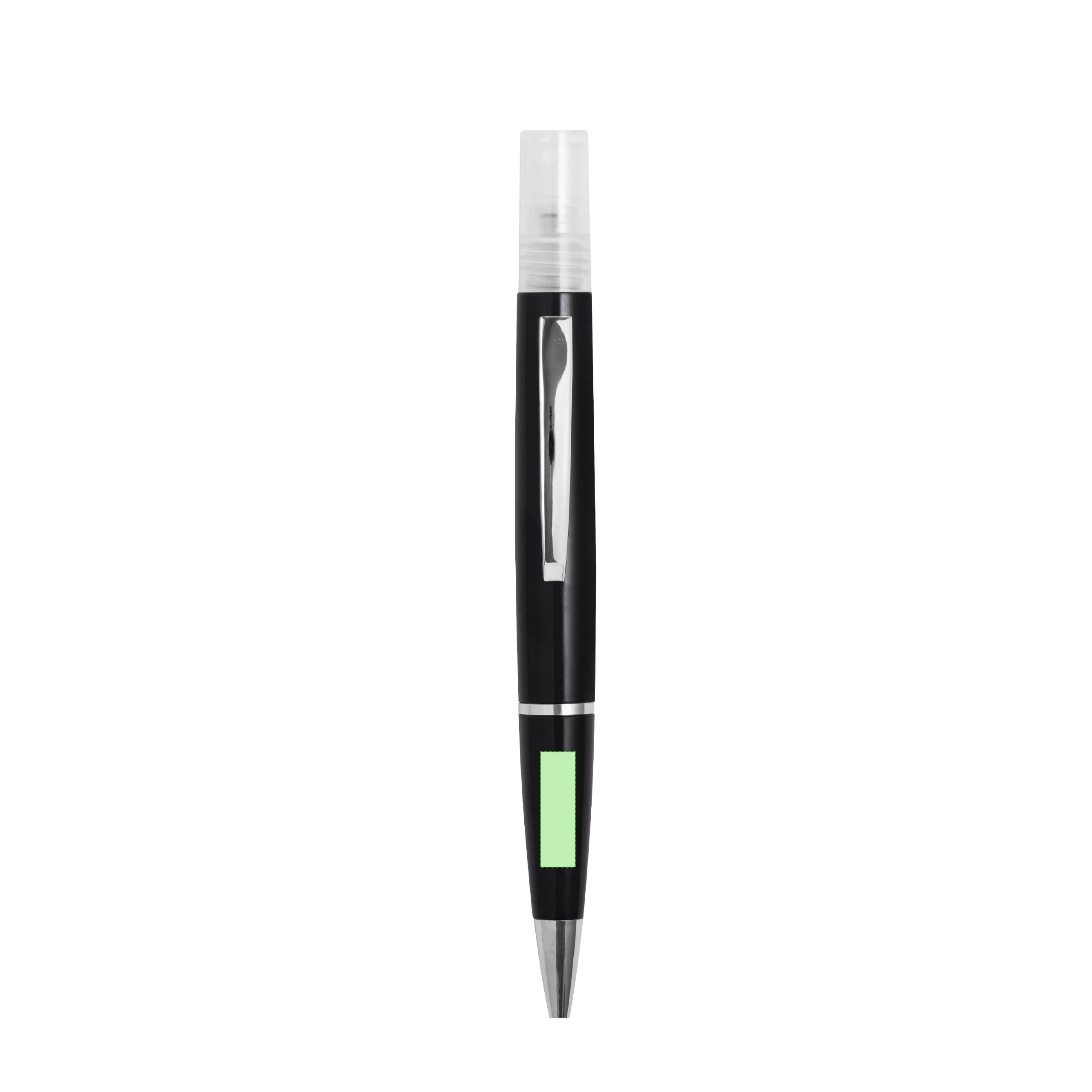 Bolígrafo higienizante con pulverizador recargable integrado y capucha protectora. Acabado en resistente ABS brillante con elegante clip metálico y cómoda empuñadura y escritura en tinta azul. Capacidad del pulverizador 3ml. Líquido no incluido. Disponible en amplia y variada gama de colores.