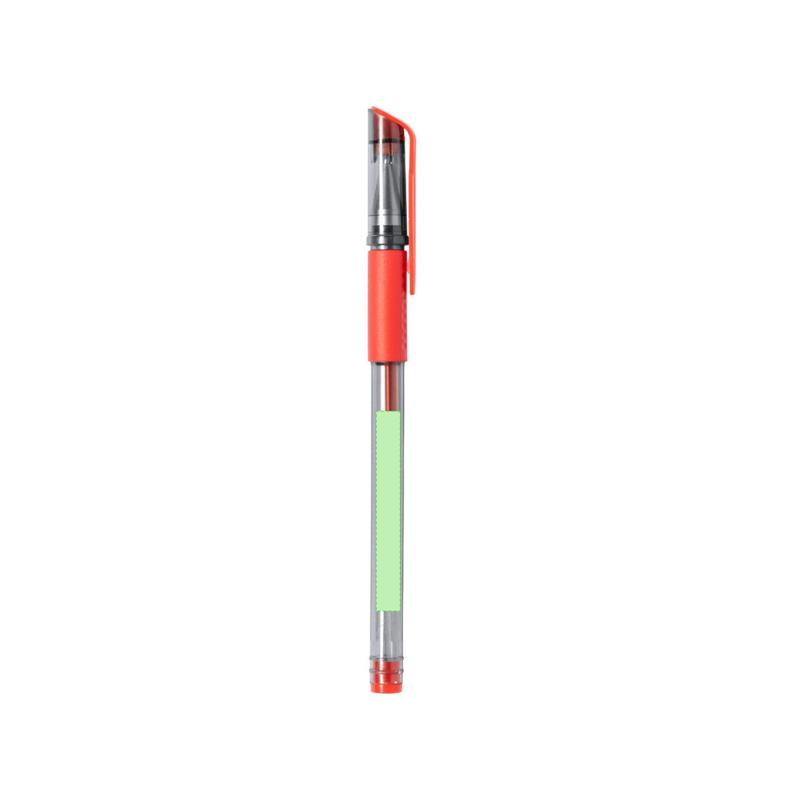 Bolígrafo en tinta gel de original diseño transparente, con empuñadura, capucha y detalles a juego. Disponible en varios colores de escritura, con tinta en el mismo color que los acabados del bolígrafo.