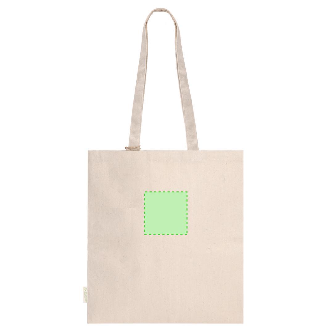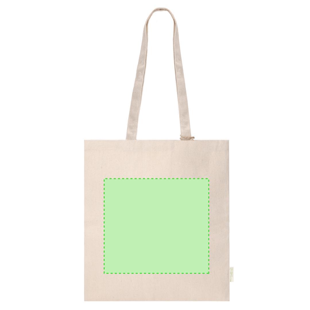 Bolsa confeccionada principalmente en algodón reciclado de 280 g/m2. Asas largas de 70cm con refuerzo, de acabado cosido. Logotipo en etiqueta lateral y resistencia hasta 10 kg de peso.