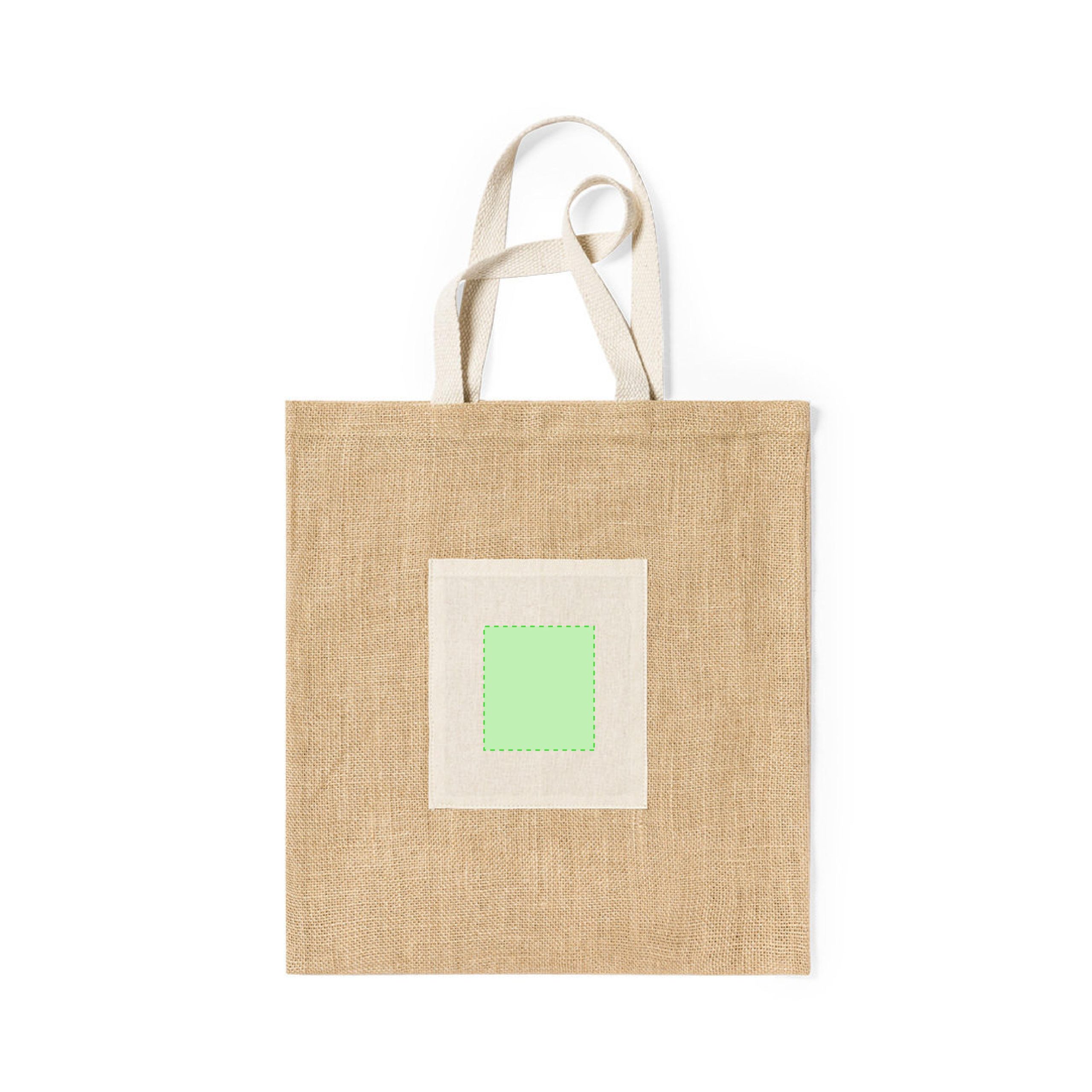 Bolsa en resistente combinación de cuerpo en yute de 240g/m2 y asas de algodón, todo en tono natural. De acabado cosido, con asas medianas reforzadas. Bolsillo frontal de algodón y resistencia hasta 6kg de peso.