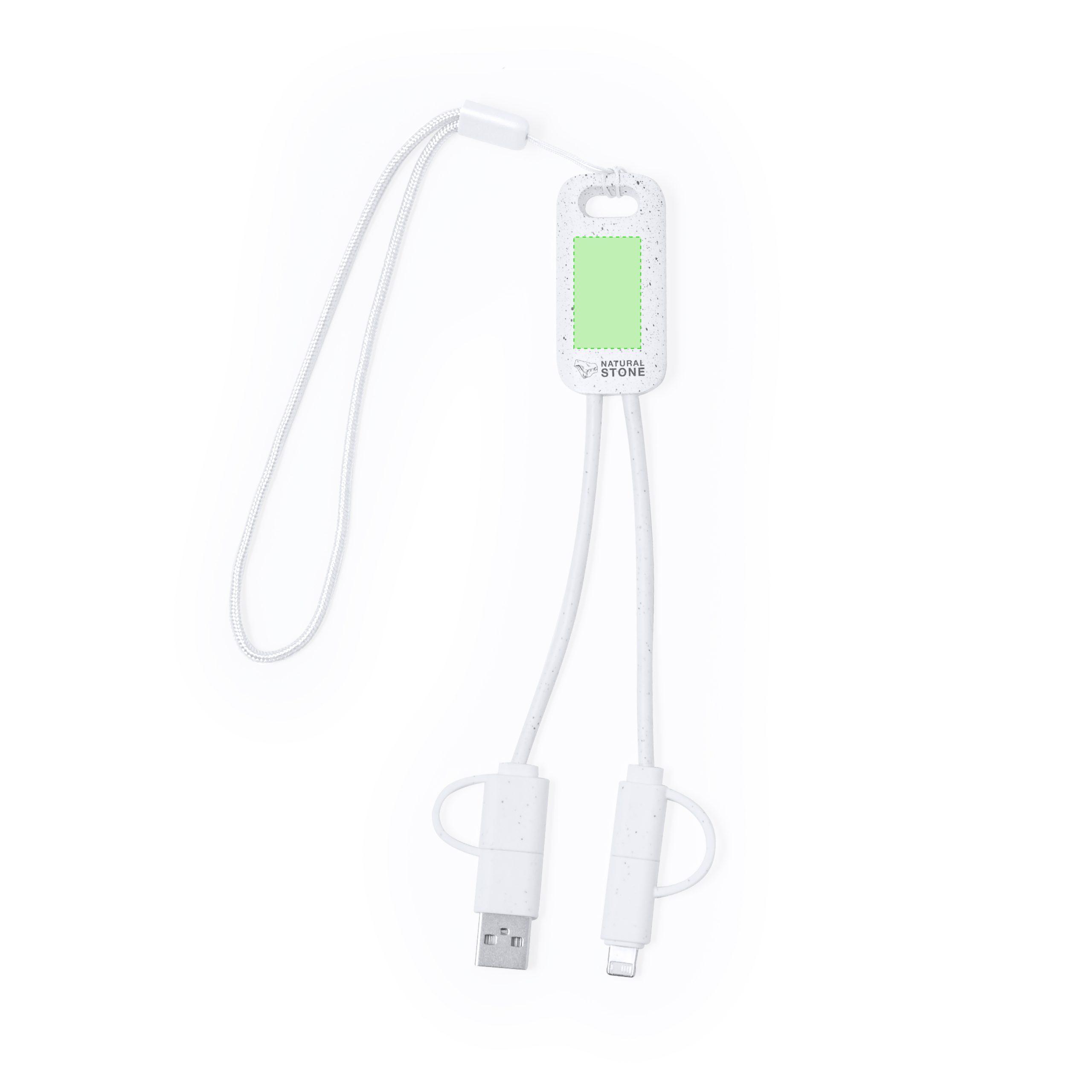 Cable cargador fabricado a partir de extractos de piedra natural en combinación con resistente ABS. Con conexiones de entrada Tipo C/USB y salidas Tipo C, Lightning y Micro USB. 5V DC 2.4A. Presentado en caja individual de diseño kraft.Fabricado con extractos de piedra natural, ayudando a la reducción del uso de plásticos, además de proporcionar un acabado suave y resistente.