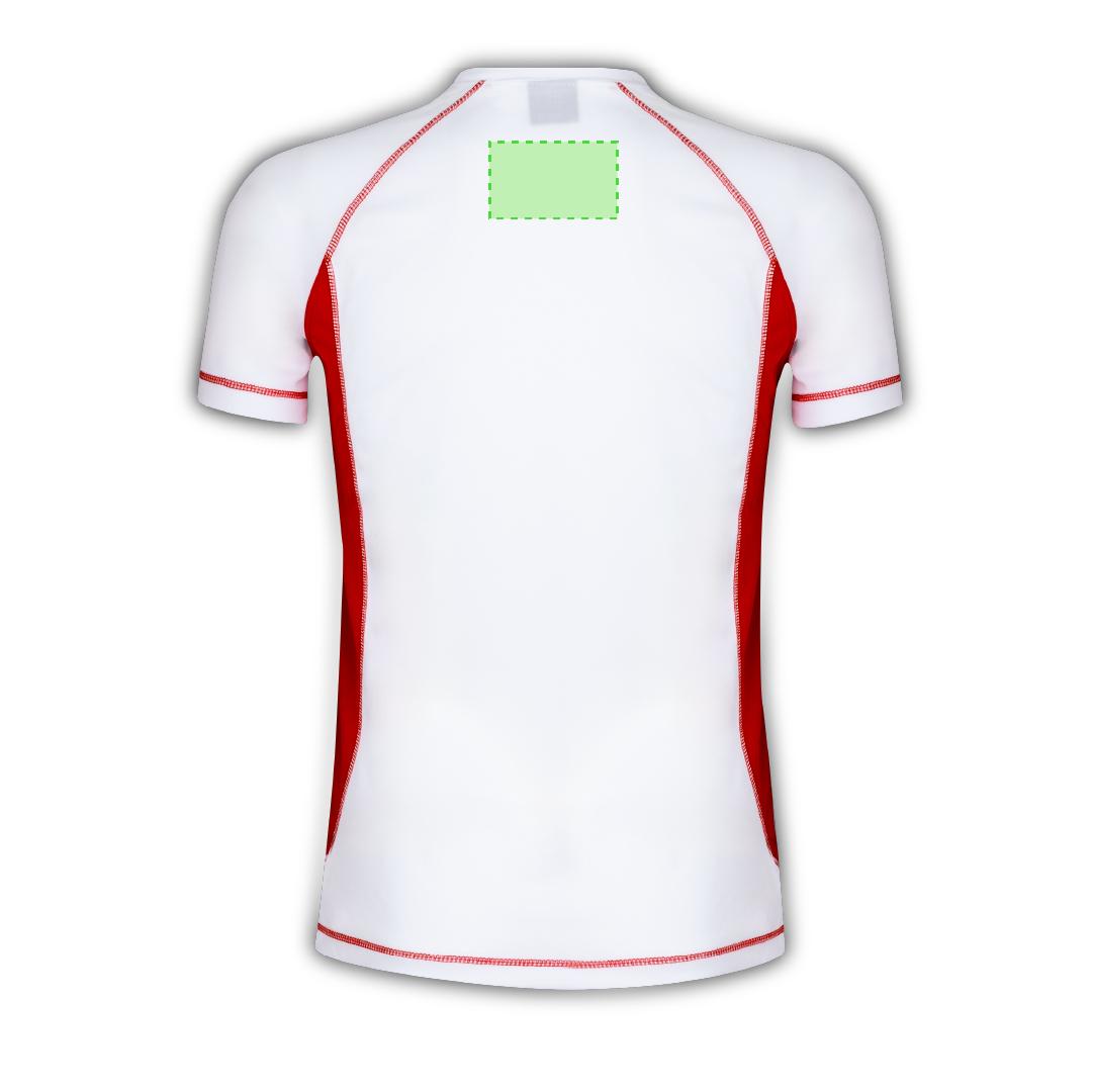 Camiseta técnica para adulto en material 100% poliéster transpirable de 135g/m2. Diseño en color blanco con costuras de refuerzo y laterales en vivos colores. Disponible en tallas S, M, L, XL, XXL.
