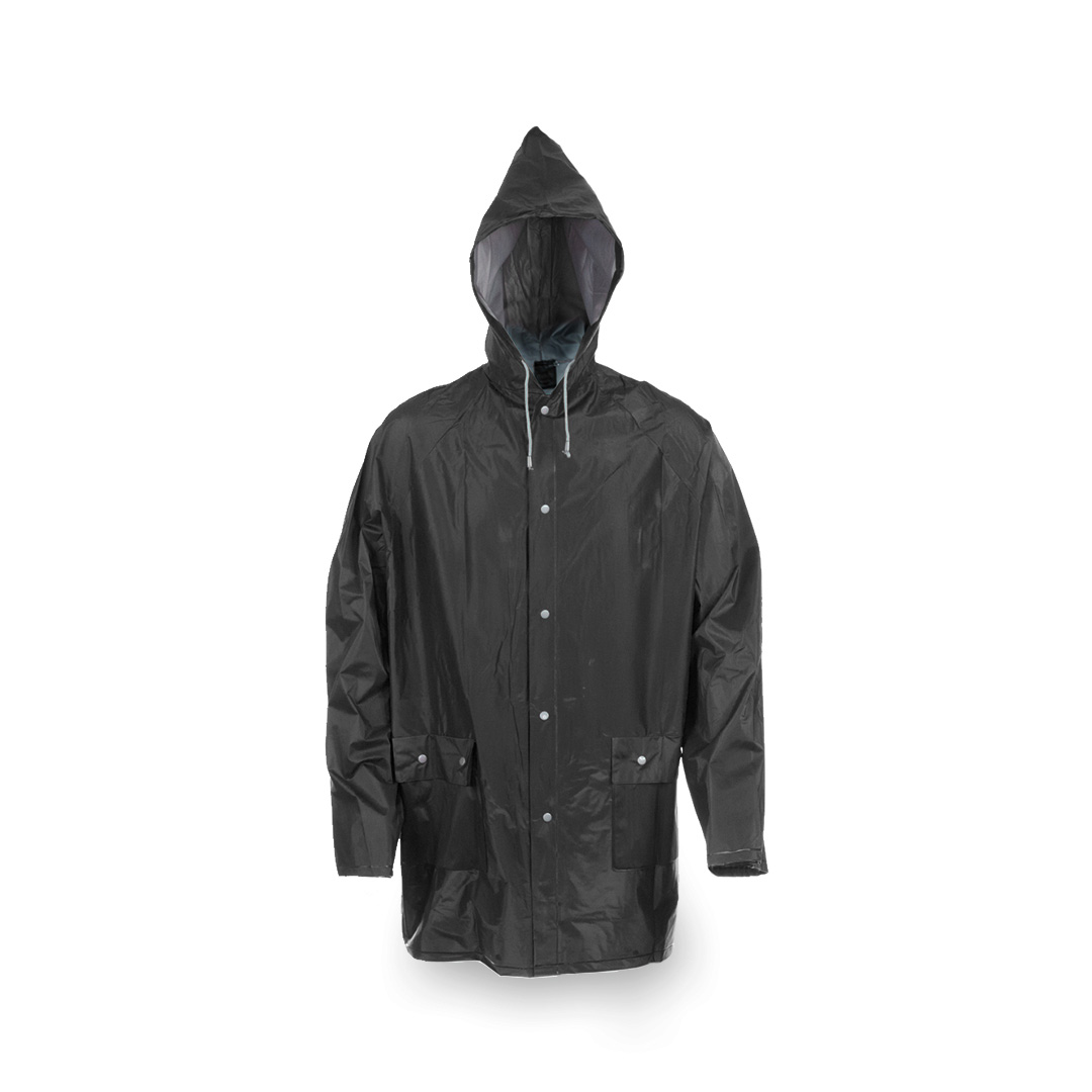 Impermeable en resistente PVC de acabado termosellado en variada gama de colores. Con capucha y cordones de ajuste, cierres de corchete y bolsillos. Disponible en tallas M-L, XL-XXL.