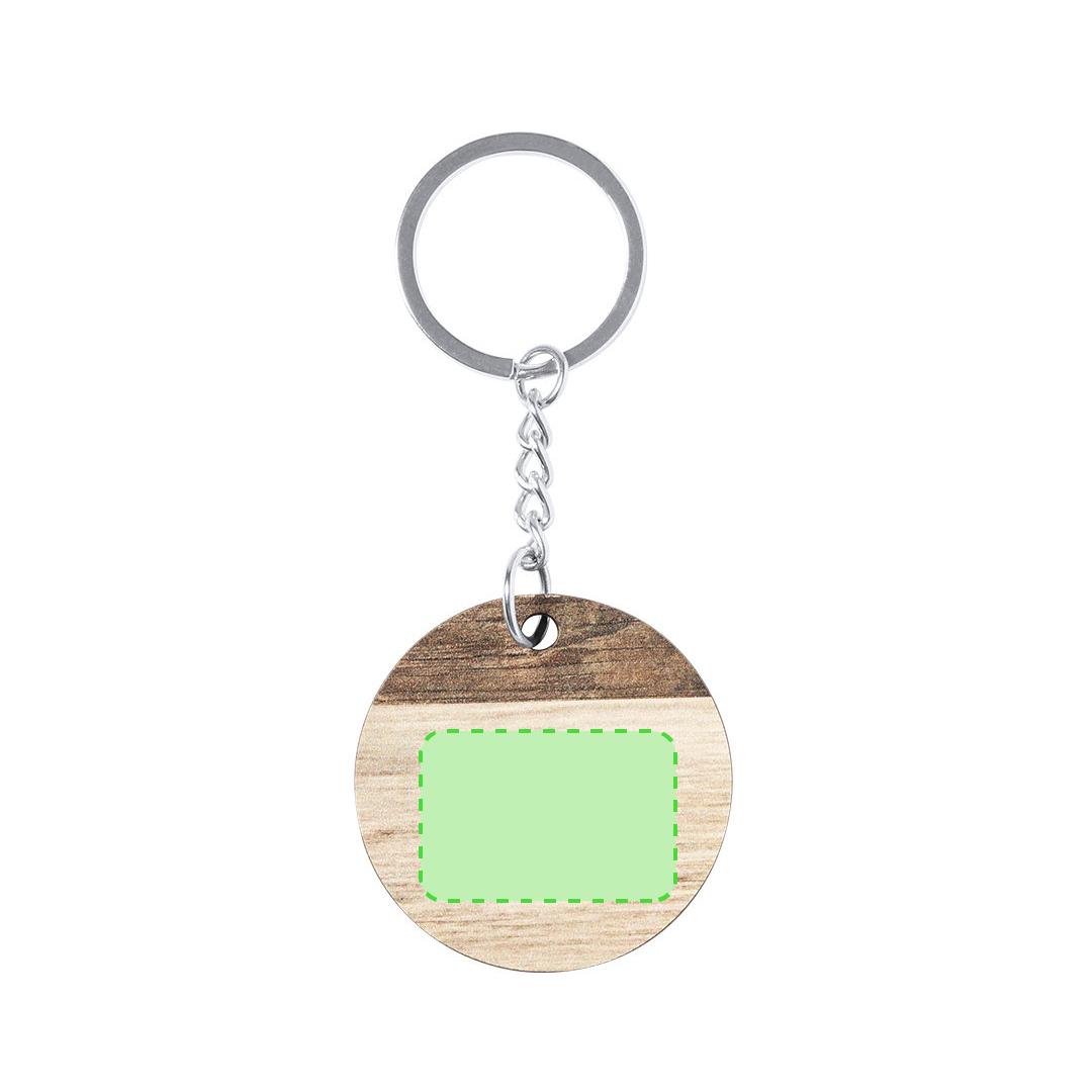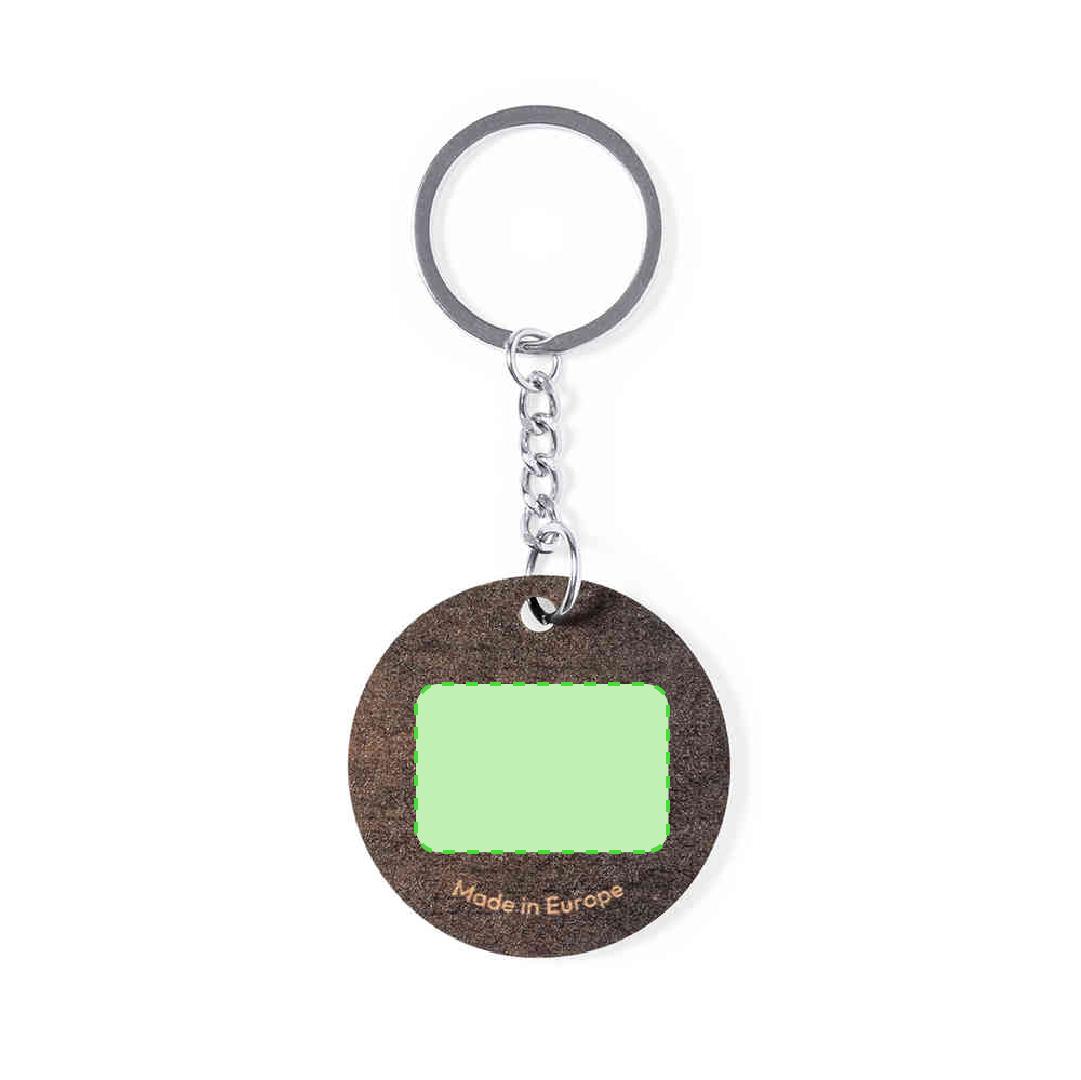 Llavero redondo, fabricado en madera natural y de original acabado bicolor. Amplia superficie de marcaje, con anilla y cadena metálicas y distintivo Made In Europe.