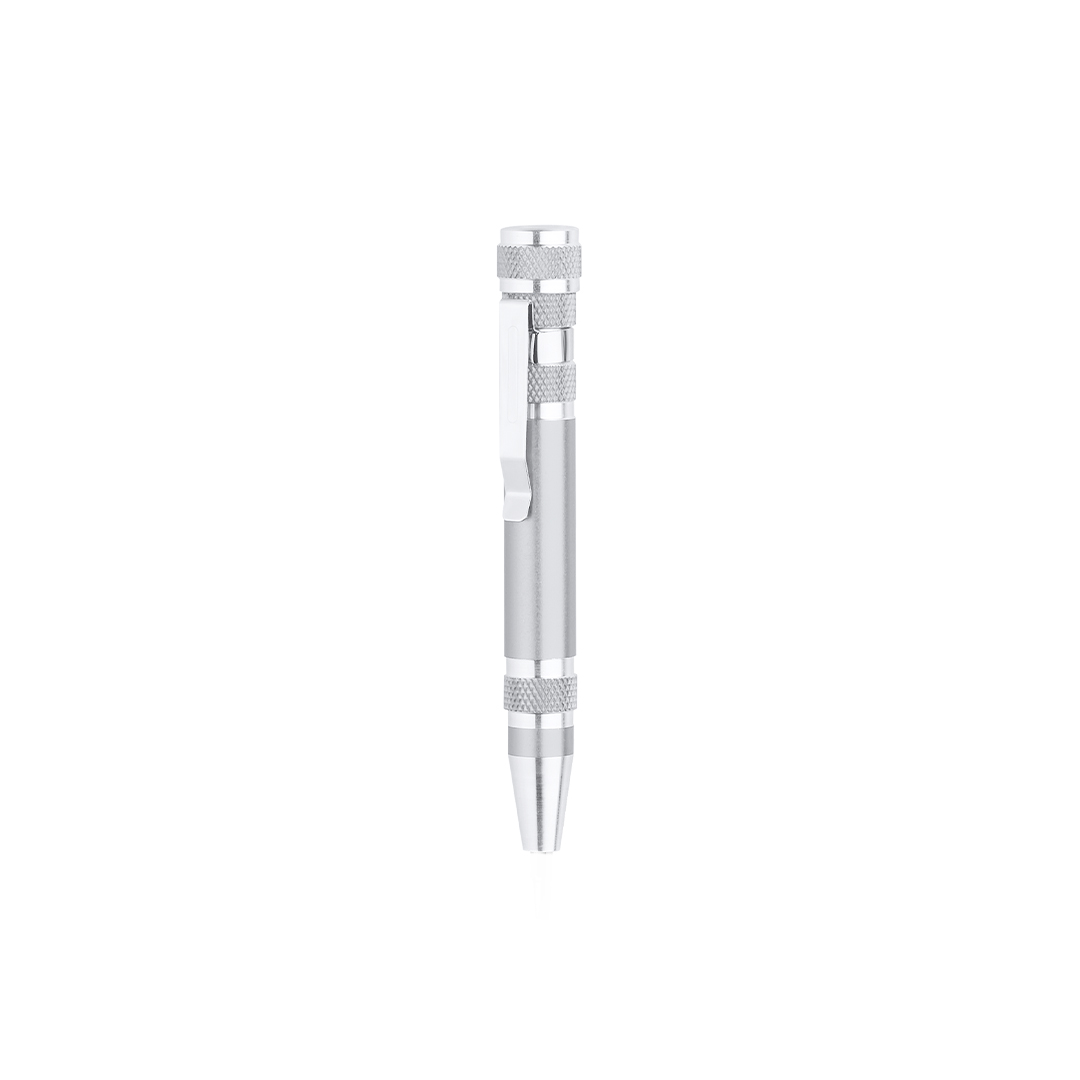 Multiherramienta de aluminio de 6 accesorios en variada gama de vivos colores metalizados. Con cuerpo anti deslizante y clip metálico. Incluye 6 cabezales destornilladores planos y de estrella.