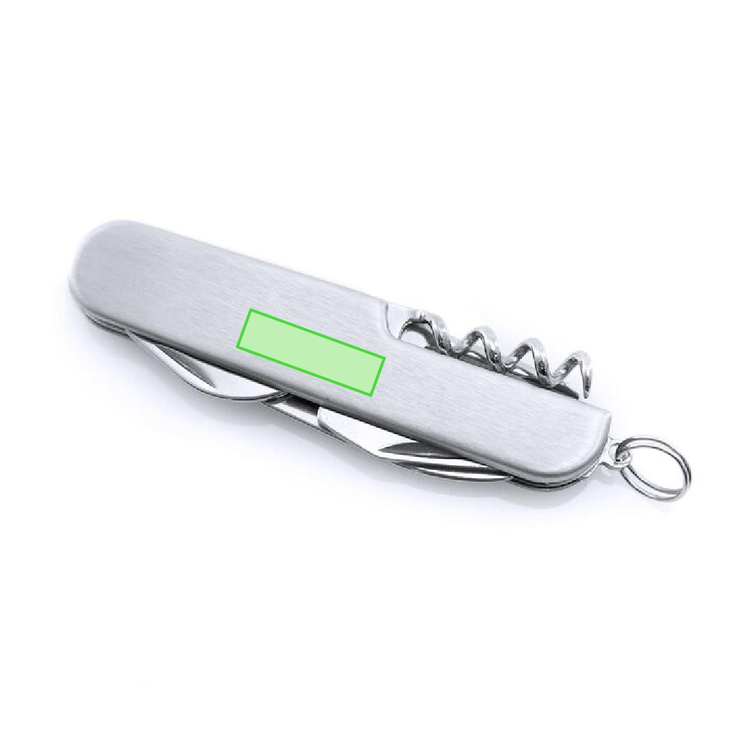 Navaja multiusos de acero inox de 6 funciones. Incluye navaja, abridores, destornillador y anilla para llavero. Presentada en caja individual.