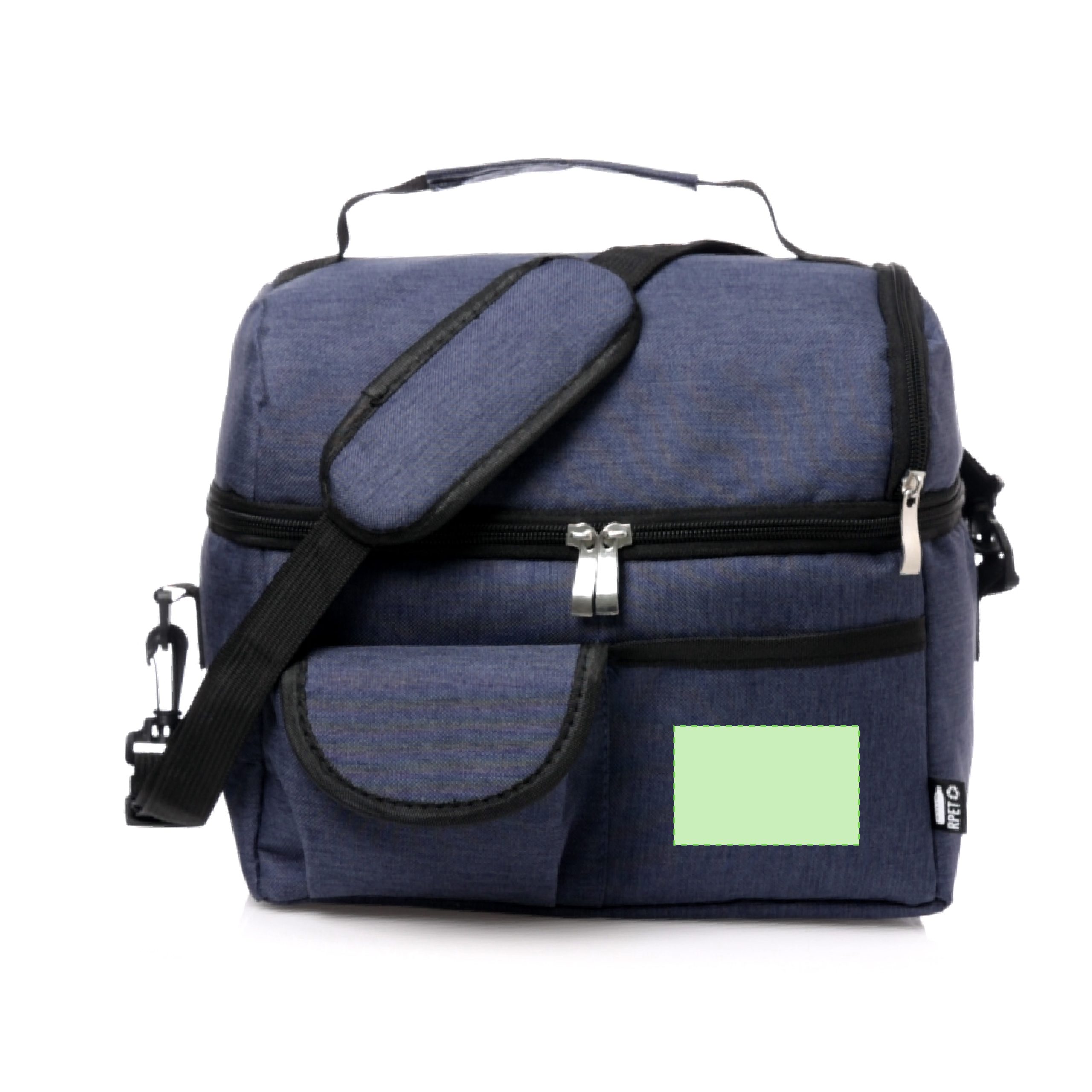 Nevera fabricada en resistente 600D RPET. Incluye 2 compartimentos independientes, con cierre de cremallera y tiradores metálicos. Interior isotermo en PEVA, con cinta bandolera ajustable y acolchado para hombro a juego. Bolsillo trasero de redecilla elástica y dos bolsillos frontales, uno de ellos con cierre de velcro. Etiqueta exterior con distintivo RPET, disponible en variada gama de colores. El material RPET se elabora a partir de plástico reciclado, para así fomentar la reutilización de residuos plásticos y ayudar a la sostenibilidad del planeta.