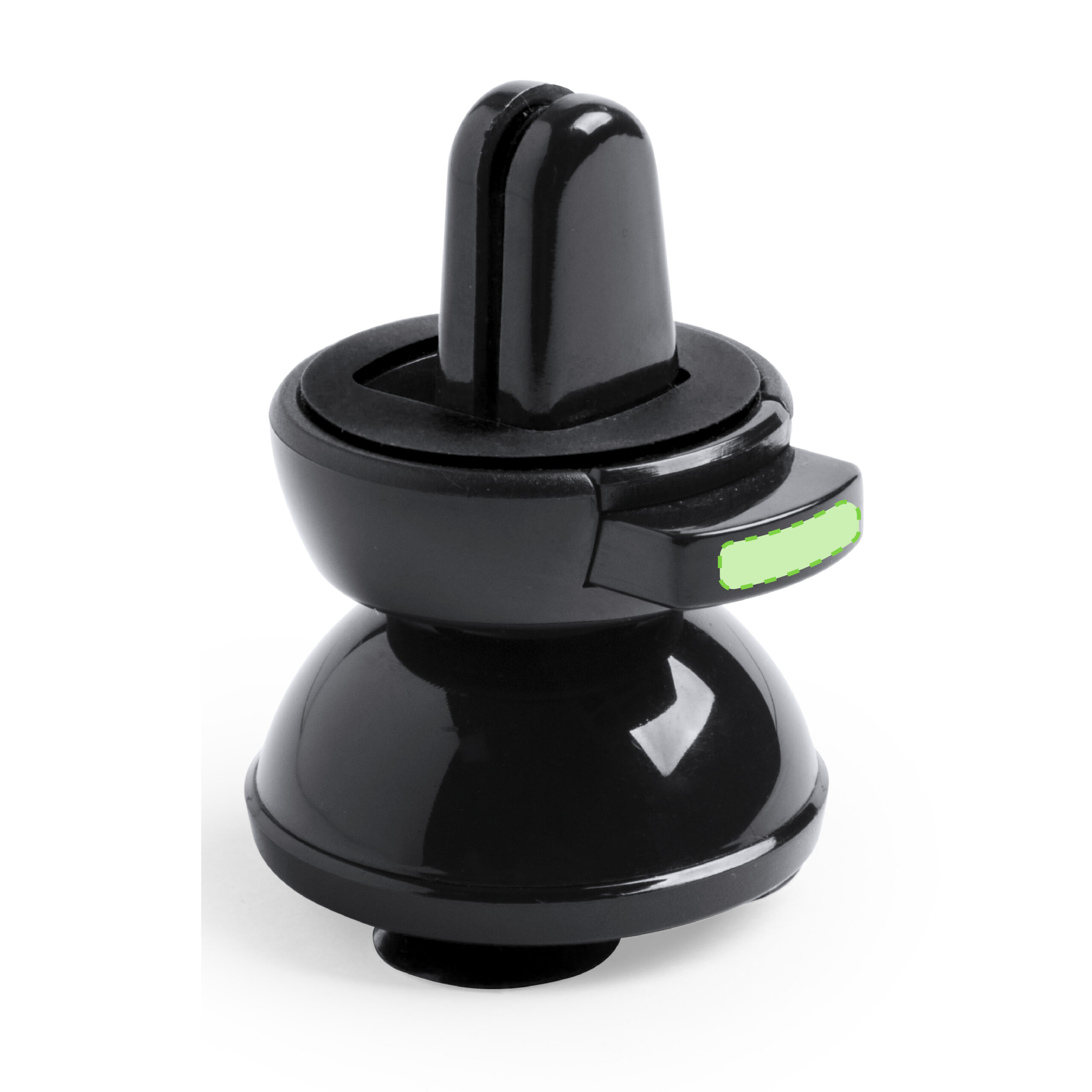 Soporte de rejilla de coche para smartphone con fijación al dispositivo mediante ventosas. En elegante color negro, con giro 360º y 45º de inclinación. Presentado en atractiva caja de diseño.