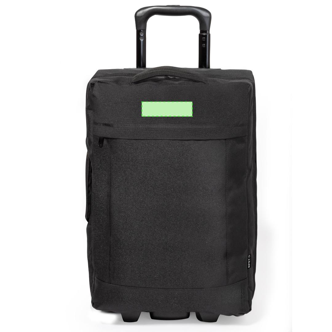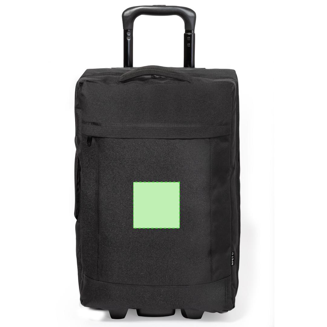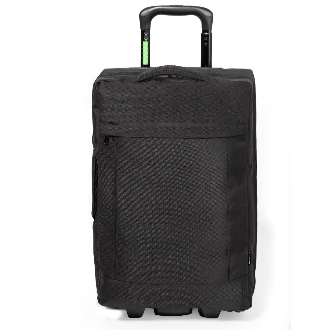 Trolley fabricado en resistente 600D RPET. Compartimento principal con cierre de cremallera de doble tirador conforme a los estándares TSA -Administración de la Seguridad en el Transporte-, que permite a las autoridades de aduanas inspeccionar el contenido del equipaje sin tener que forzar o romper el cierre, usando una llave especial a disposición de la autoridad.Interior forrado además de organizador en la zona central. Exterior con bolsillo frontal con cierre de cremallera invisible y 2 asas acolchadas de transporte. Mecanismo extensible metálico en negro, con cómoda asa de transporte y 2 ruedas. Logotipo RPET en etiqueta exterior.El material RPET se elabora a partir de plástico reciclado, para así fomentar la reutilización de residuos plásticos y ayudar a la sostenibilidad del planeta.