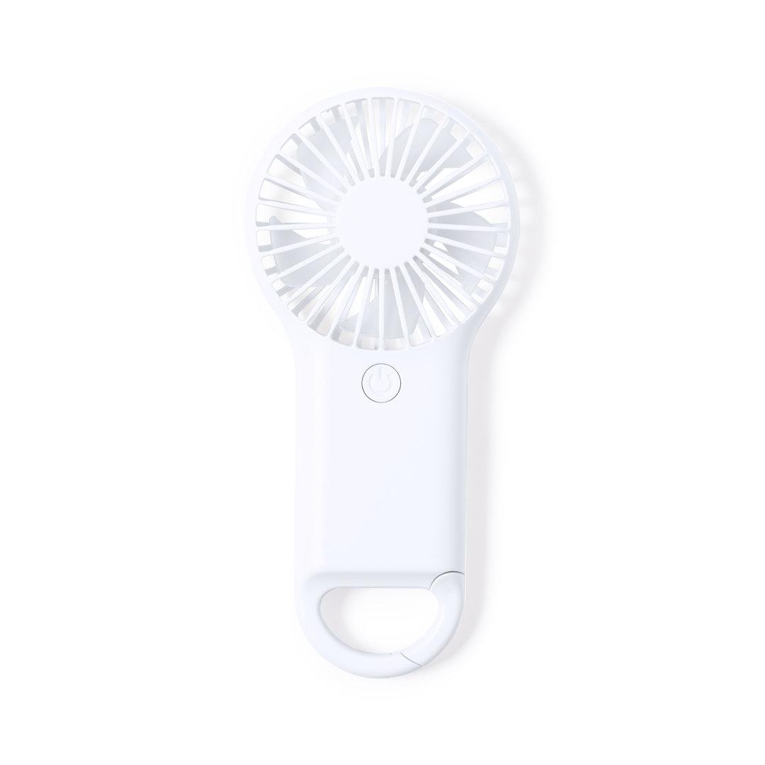 Ventilador fabricado en resistente ABS de color blanco, con mosquetón de enganche integrado. Con 2 velocidades de funcionamiento y presentado en caja individual de diseño kraft. Alimentación a pilas (3xAAA no incluidas).